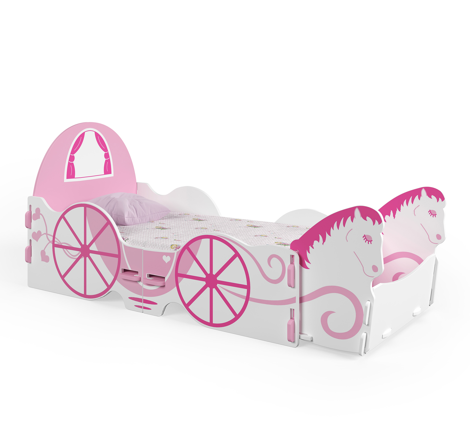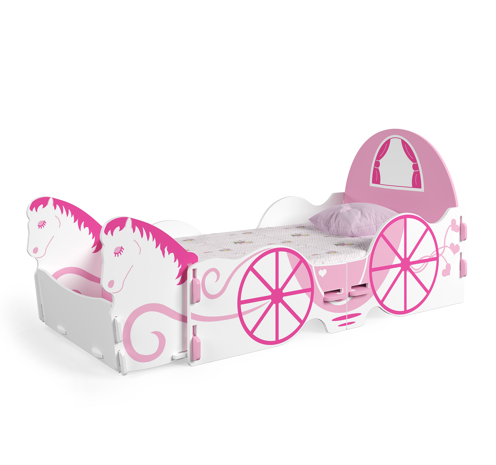 Calling all princesses everywhere… Kidsaw’s new Princess Carriage toddler bed is a must for your daughter. This toddler bed is a perfect addition to your little princesses room. All down the sides is the carriage style design, then on the front of the bed there is a toybox in the shape of horses, which looks really effective (this is detachable if not required). The bed comes in a white painted finish with screen printed designs. The Princess Carriage toddler bed is cleverly designed to just simply slot together like a jigsaw.