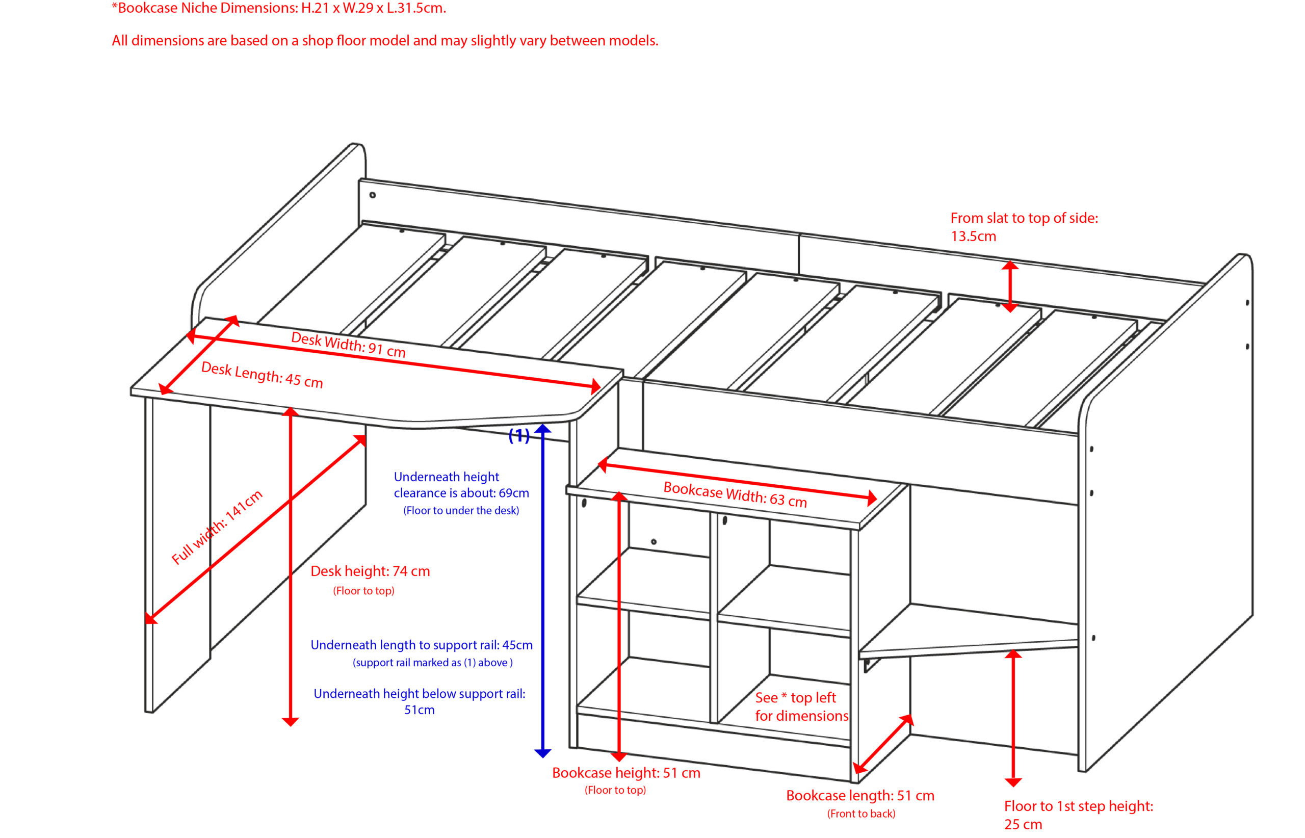 - The desk and bookcase are in a fixed position and can’t be swapped around.