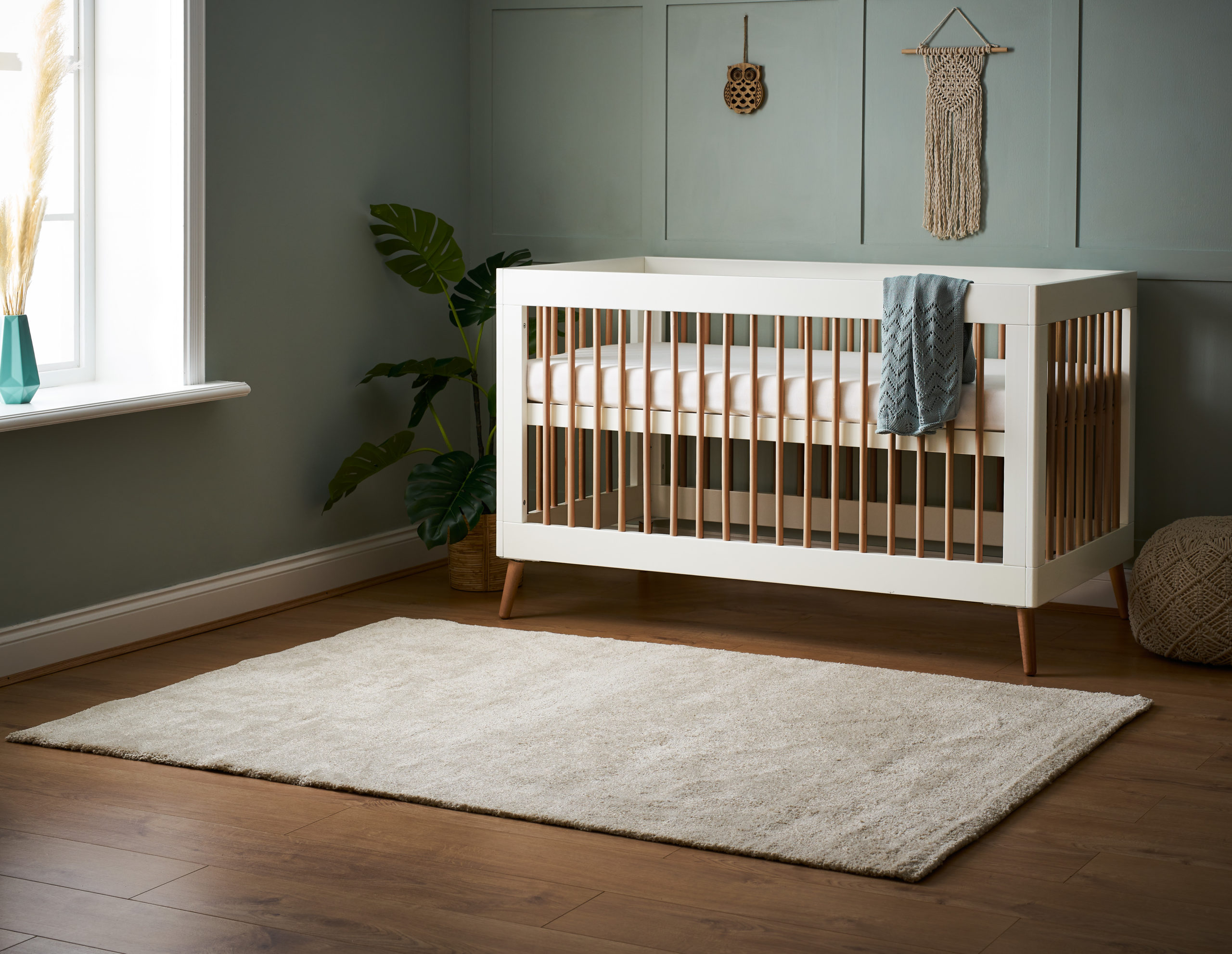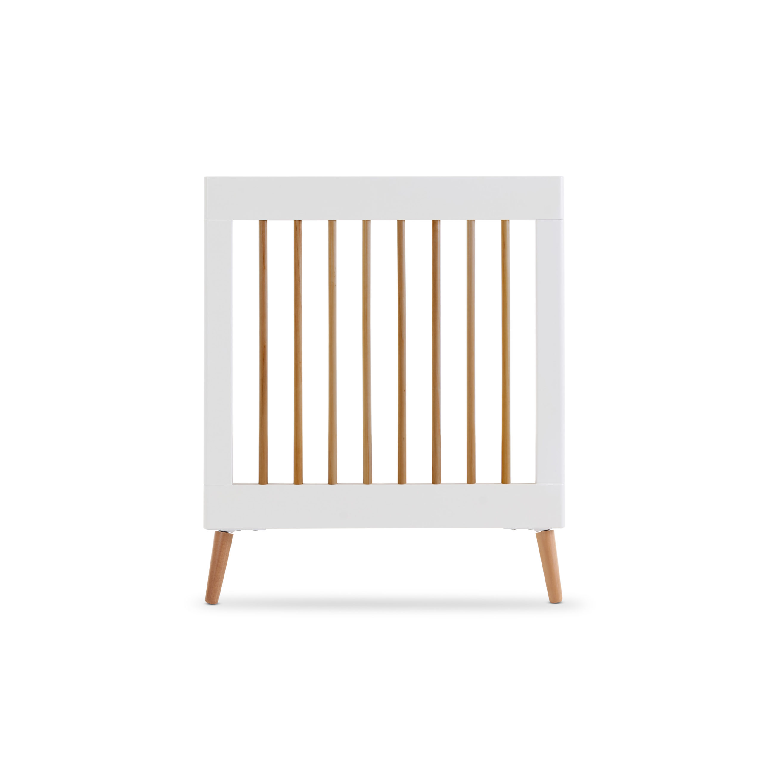 Featuring the same aesthetic and high-quality finish of the regular sized cot bed, the Maya cot bed means families with a more compact nursery do not have to compromise when looking for a space-saving alternative. The top position of the three height-adjustable mattress base allows you to put down your baby with less pressure and strain applied to your back and as they develop and find their feet, you can maintain their safety by lowering the base. When your little one is ready to begin their transition, the included safety rail will provide reassurance and familiarity during an often daunting time and once they are used to their “big bed” this can be simply removed to create a stylish toddler bed.