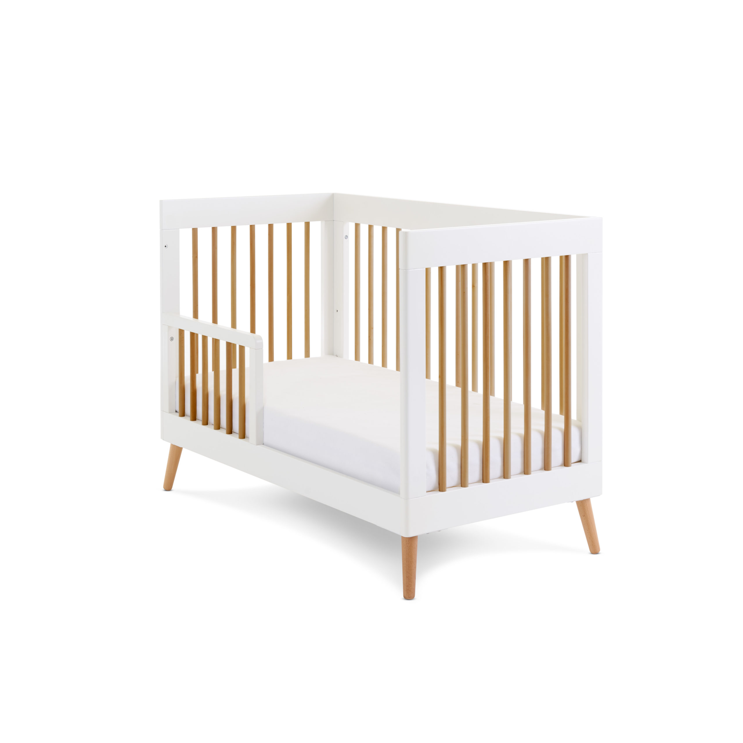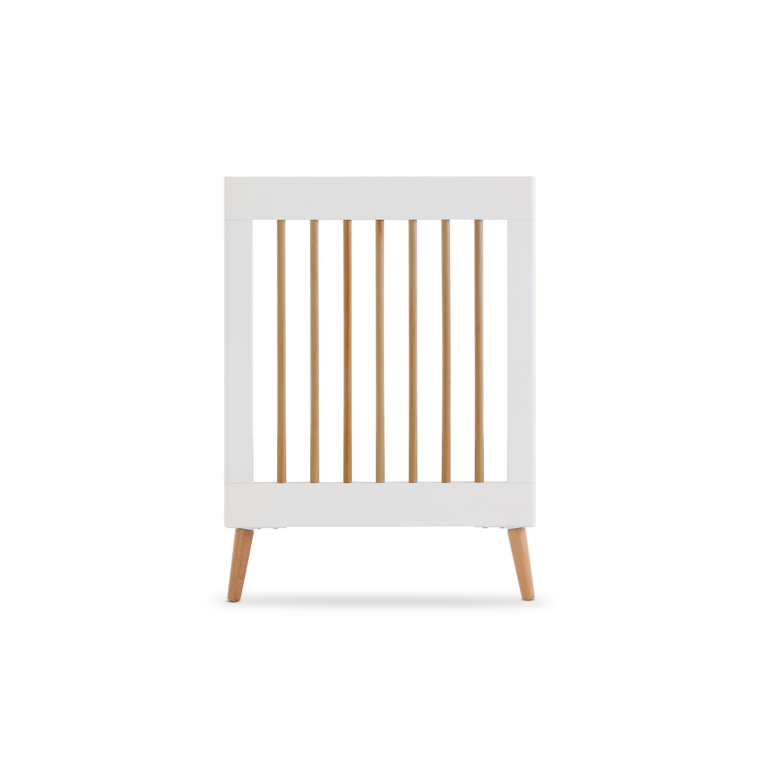 Featuring the same aesthetic and high-quality finish of the regular sized cot bed, the Maya Mini cot bed means families with a more compact nursery do not have to compromise when looking for a space-saving alternative. The top position of the three height-adjustable mattress base allows you to put down your baby with less pressure and strain applied to your back and as they develop and find their feet, you can maintain their safety by lowering the base. When your little one is ready to begin their transition, the included safety rail will provide reassurance and familiarity during an often daunting time and once they are used to their “big bed” this can be simply removed to create a stylish toddler bed.