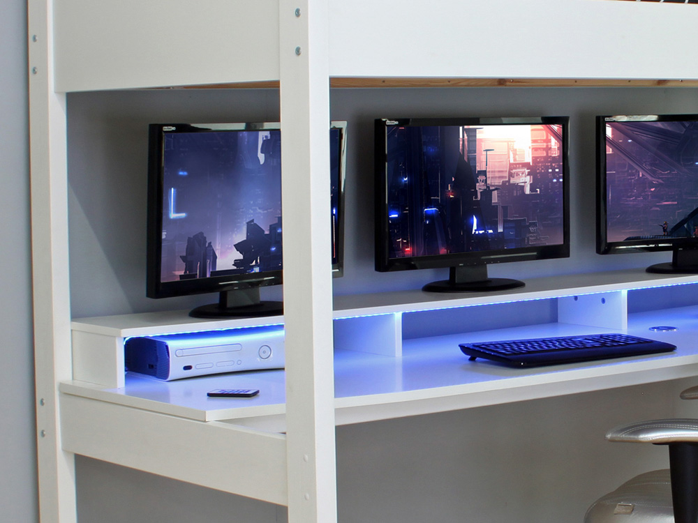 The under bed section comes with a full length desk and a raised shelf to accommodate several monitors and includes LEDs with a remote control to change the colours and a wireless charger.