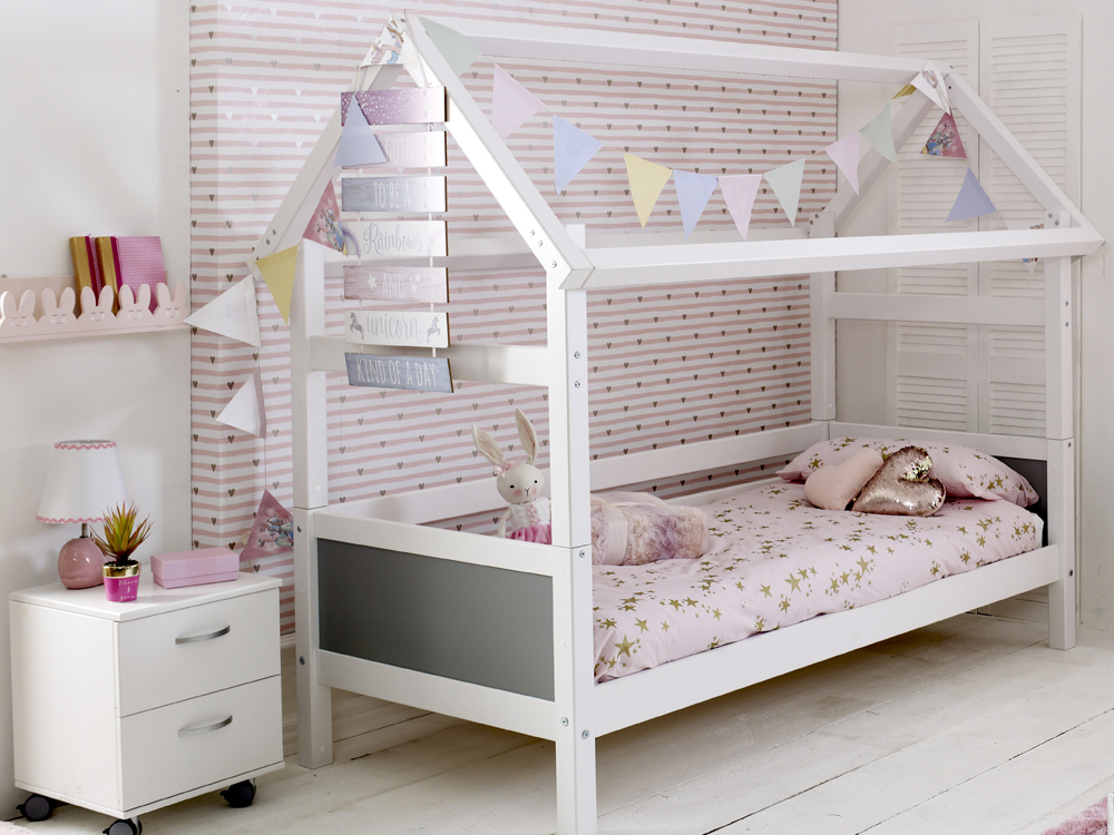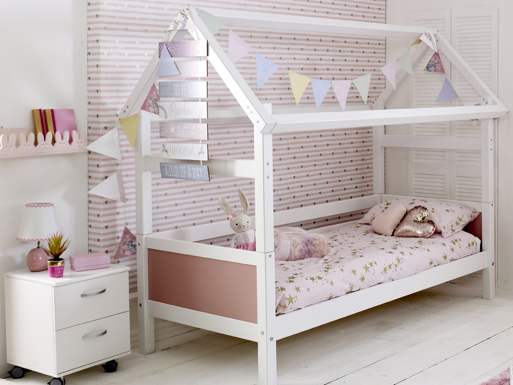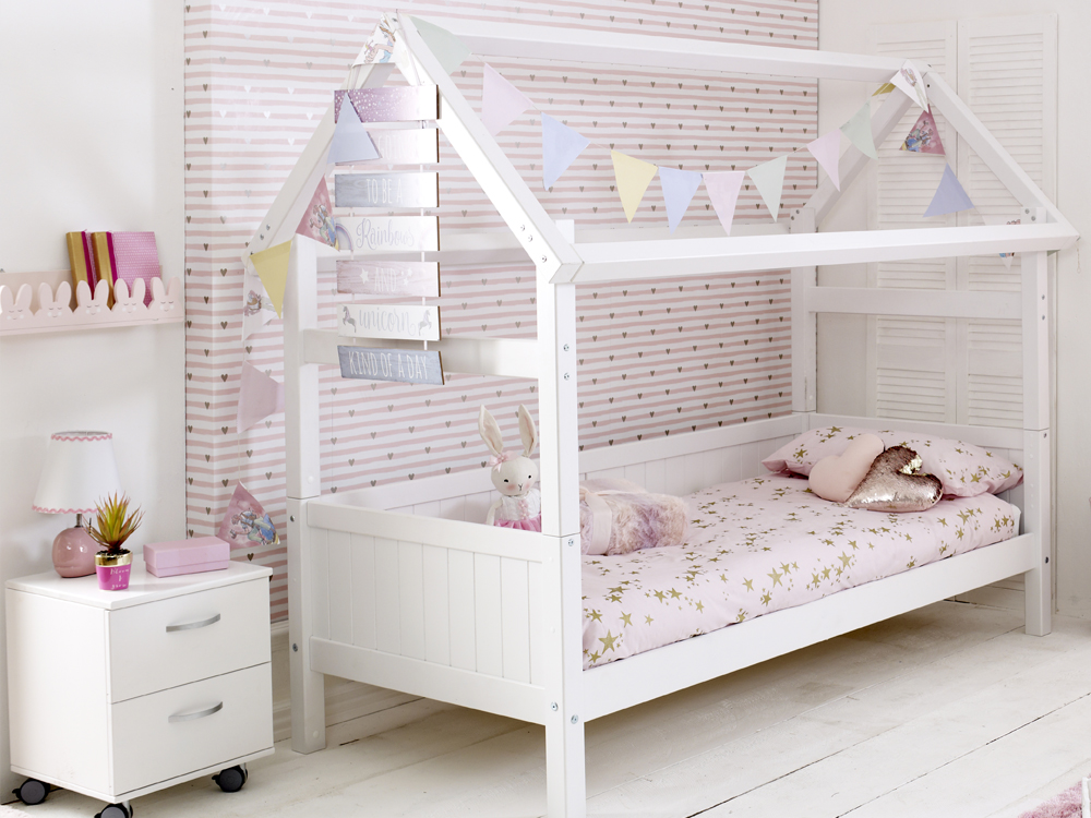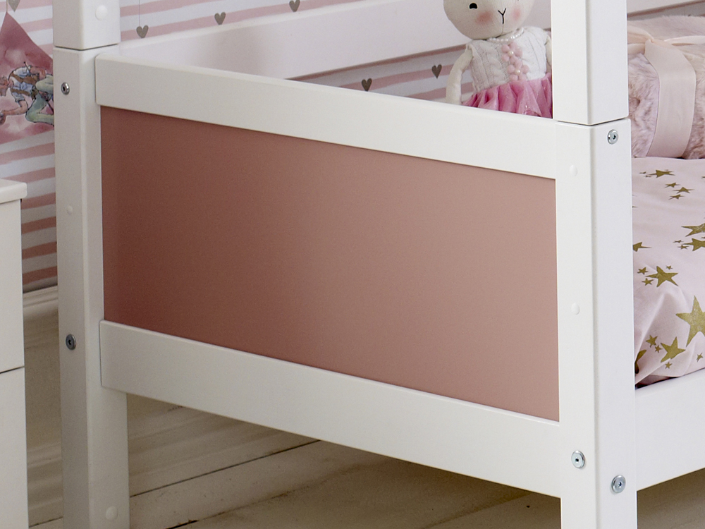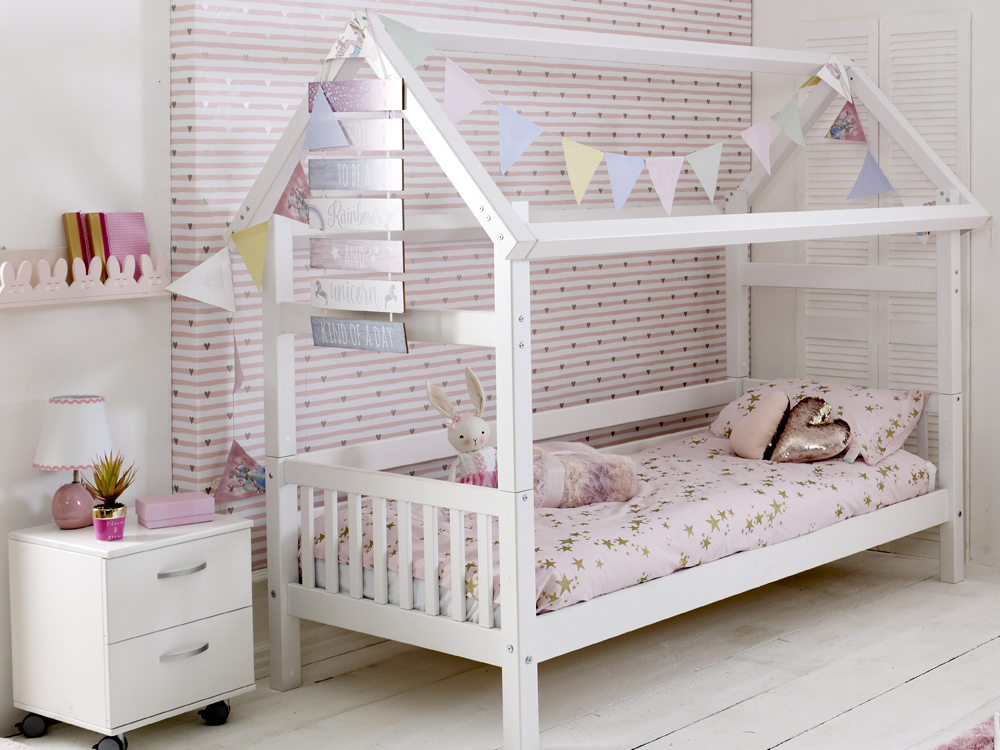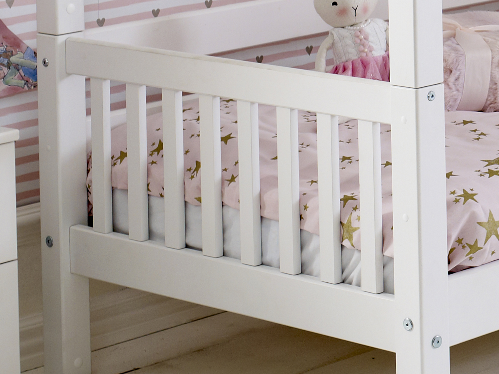Made of solid pine with an elegant white finish, the Playhouse Bed is strong and sturdy enough to withstand both sleep and necessary home maintenance. The gabled “roof” gives a whimsical, country feel, while the open construction gives endless opportunities for simple decoration and redecoration, from gingerbread cottage to jungle hideout. And with a choice of different end panels, the more permanent look of the bed is also extremely versatile.