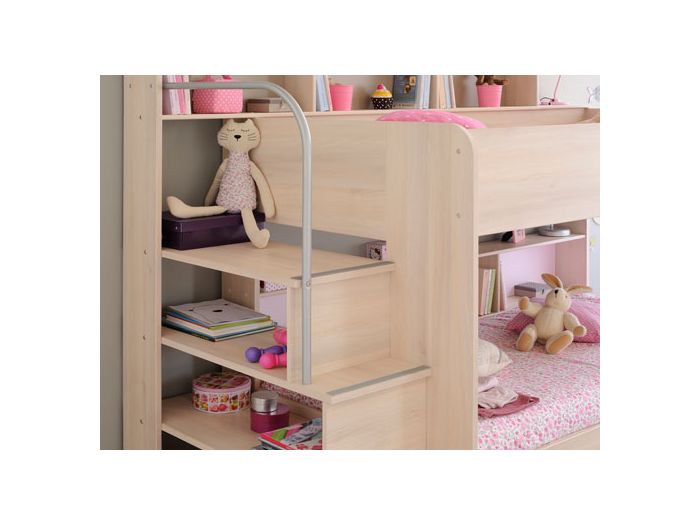 This is far more than a bunk bed it provides numerous shelving options for storage and displaying priceless treasures, with deep solid step providing easy access to the top sleeping zone and a fixed hand rail for good measure.