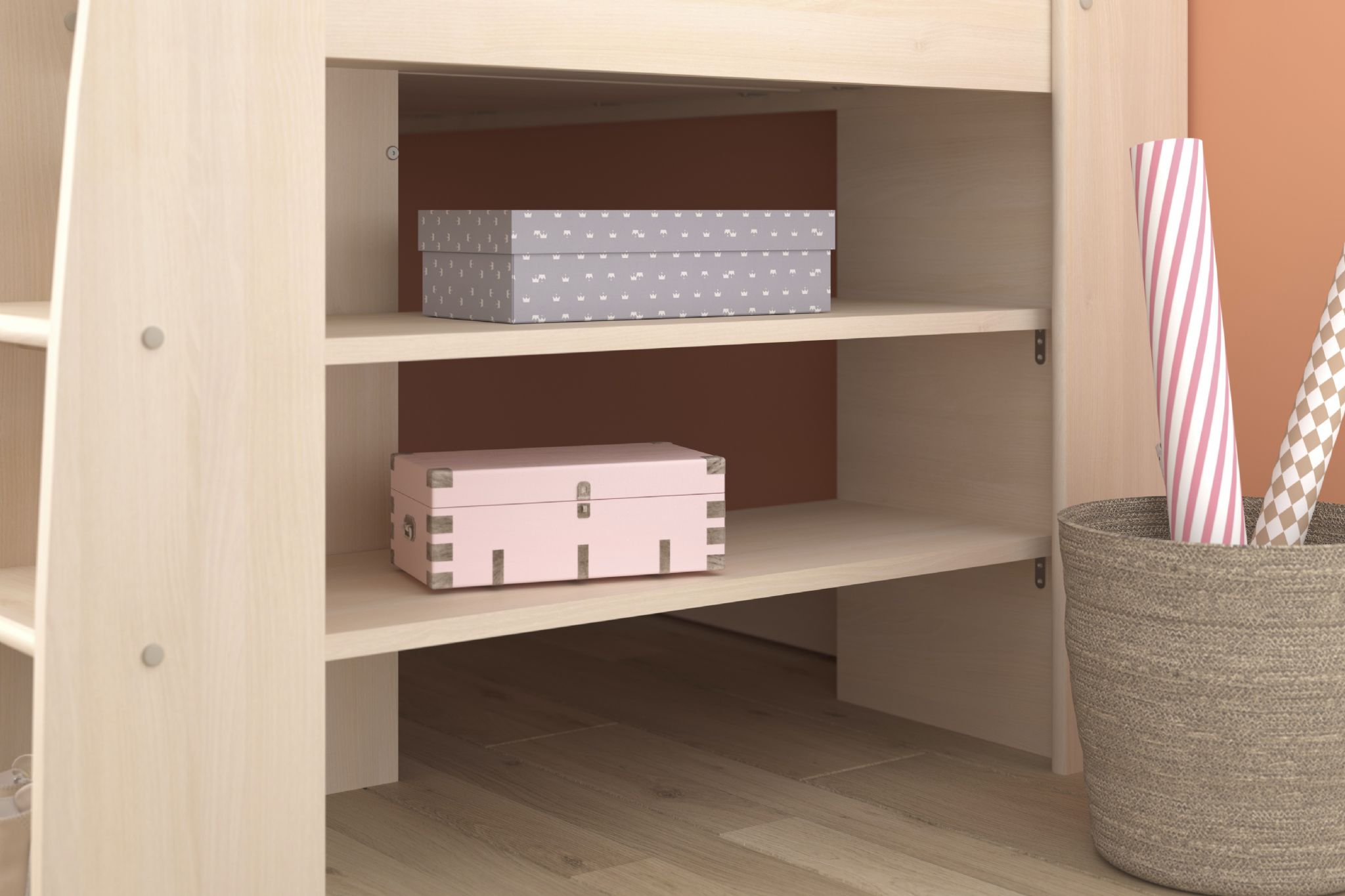 The Kurt midsleeper is a winning design that incorporates a raised sleeping section, with functional storage, a cupboard and numerous shelving sections with a free standing desk, for study to complete the package.