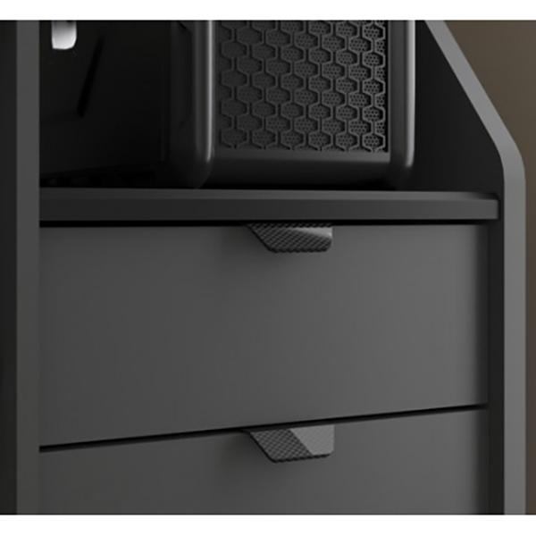 This modern looking piece of furniture has a dark grey and black stipple finish along with carbon finish handles that make this unit a stunning addition to any home or office. NB: Chair shown not included.