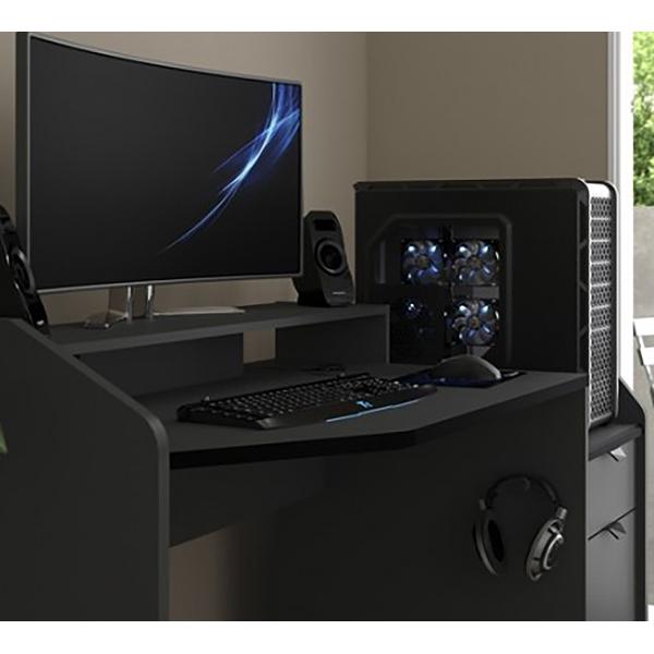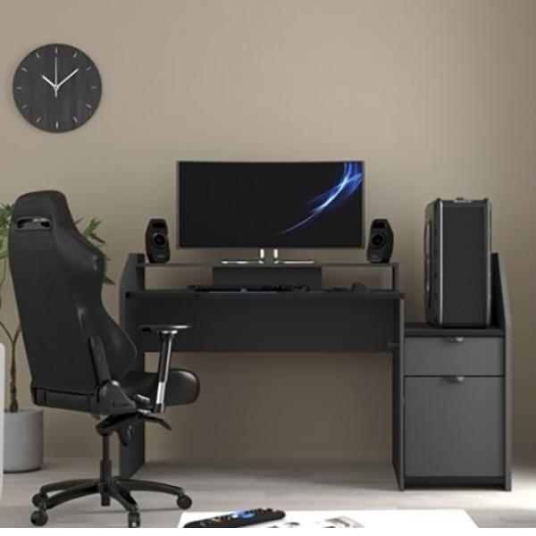 It has everything any busy gamer could need. The large top shelf is big enough for up to two large monitors. A generously sized ergonomically designed desktop below accommodates the keyboard, mouse, controllers or PC and more. It has an infrared compatible resistant coating, so no mousemats are needed.