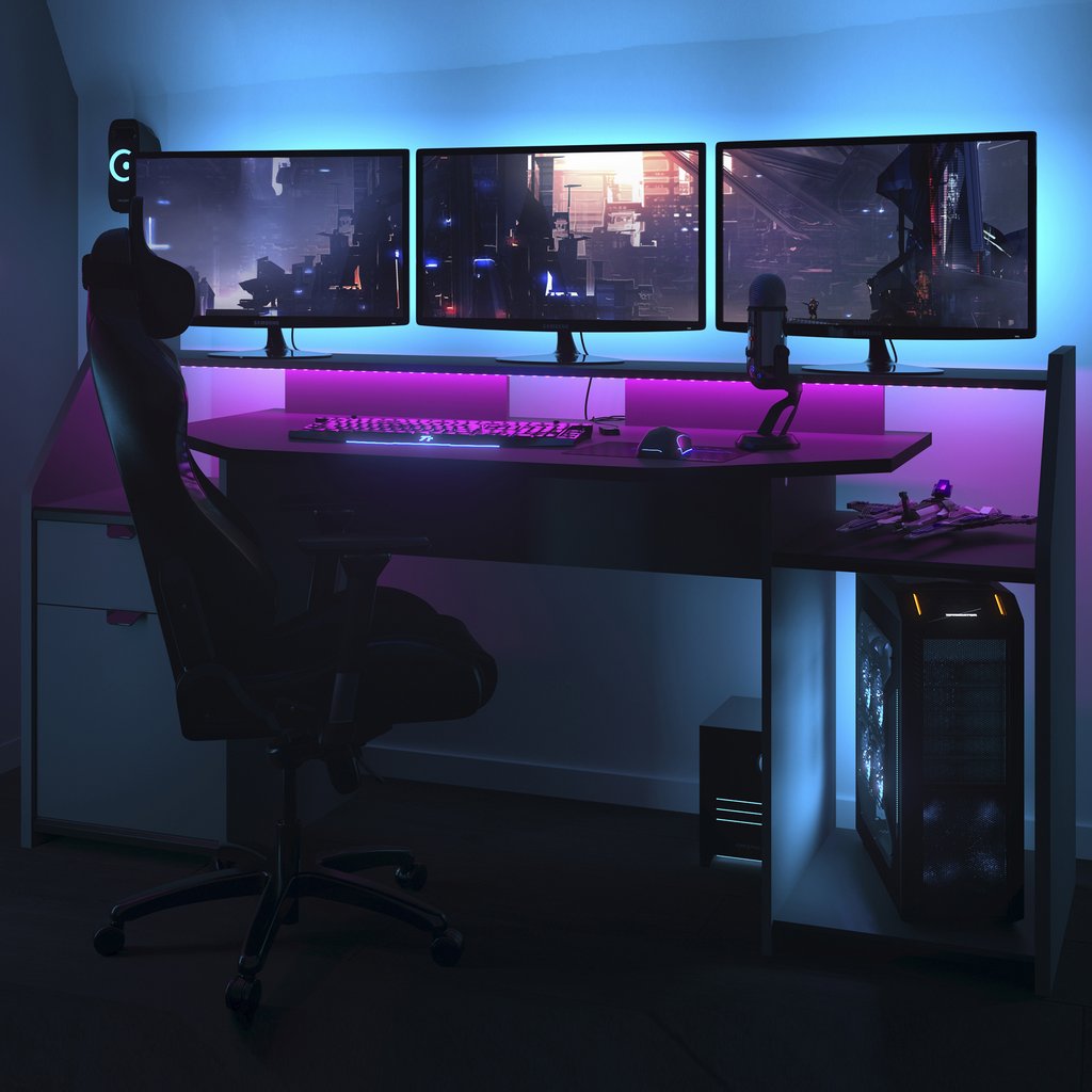 The new Parisot Setup gaming desk has been designed with gamers fully in mind! It has everything any busy gamer could need. This is the original innovative French gaming desk – beware of inferior high street imitations! The large top shelf, at 175 cm in length, is big enough for up to three large monitors. A generously sized ergonomically designed desktop below accommodates the keyboard, mouse, controllers or PC. It has an infrared compatible resistant coating, so no mousemats are needed.