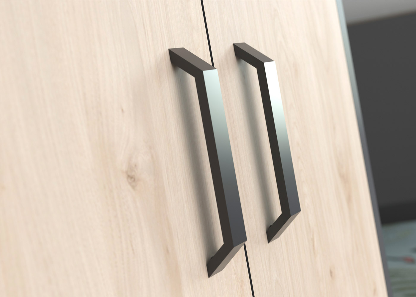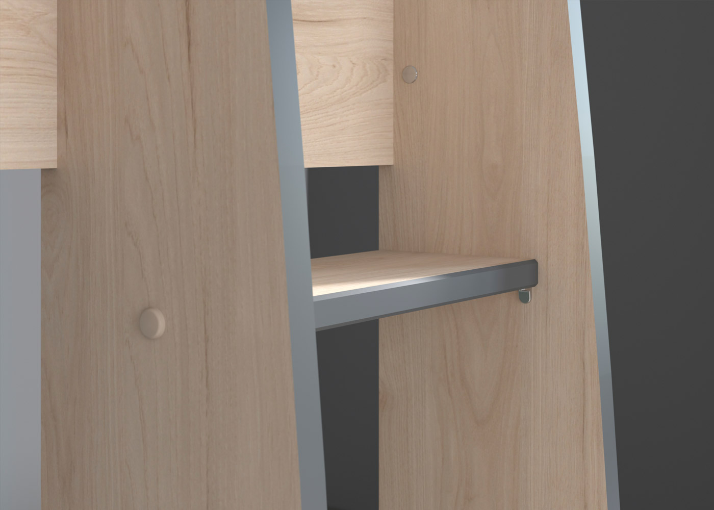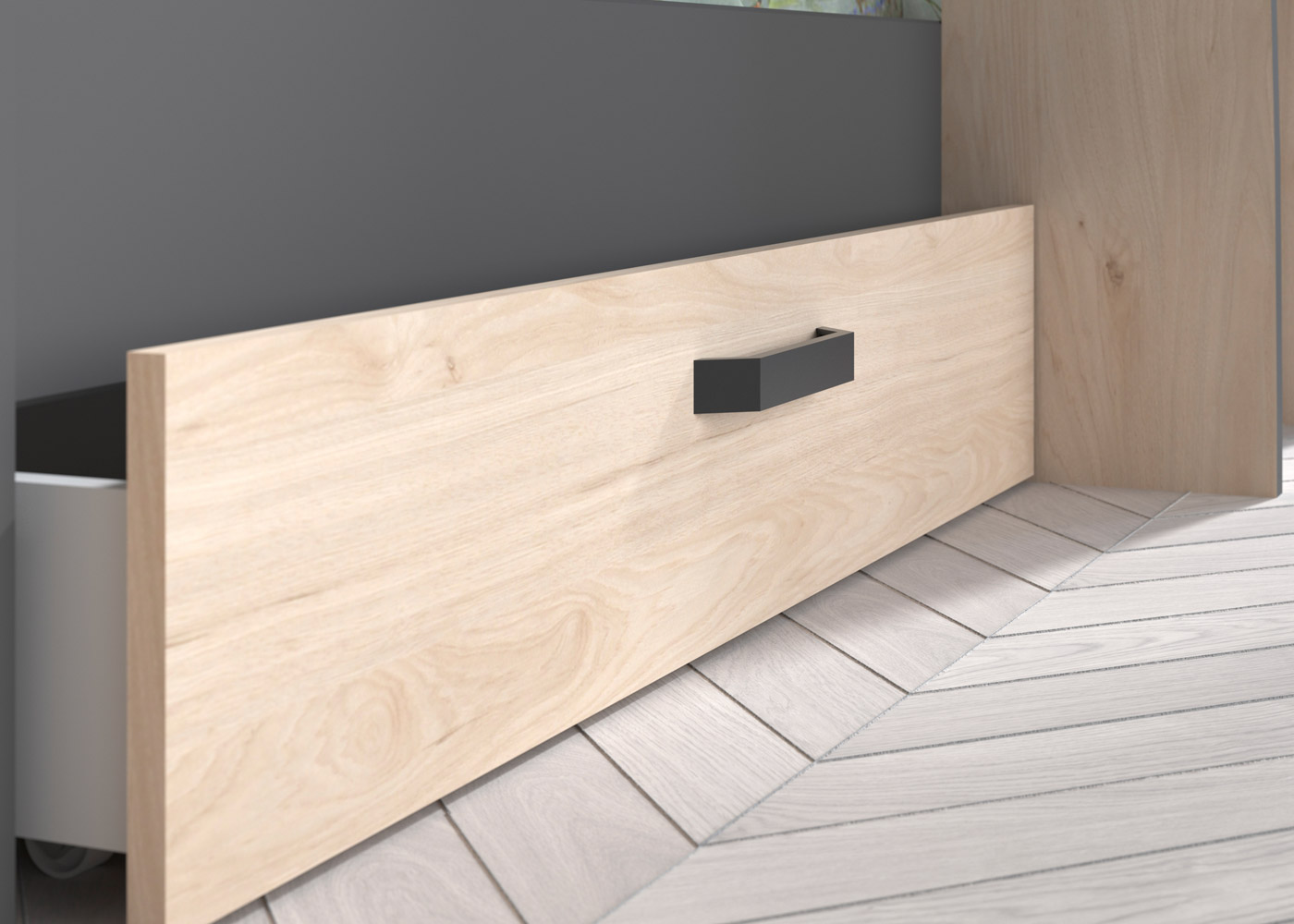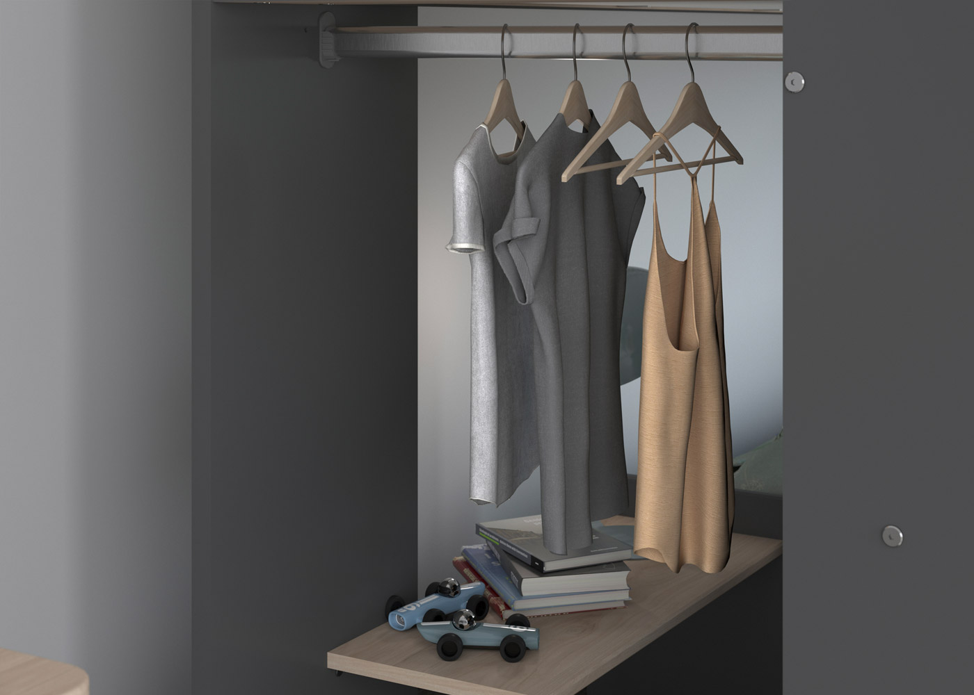 Set at an angle above each other, the positioning of the mattress bases allows for the incorporation of a wardrobe at the head of the bottom bunk. In addition, a drawer sits underneath the bunk for superb storage capacity.