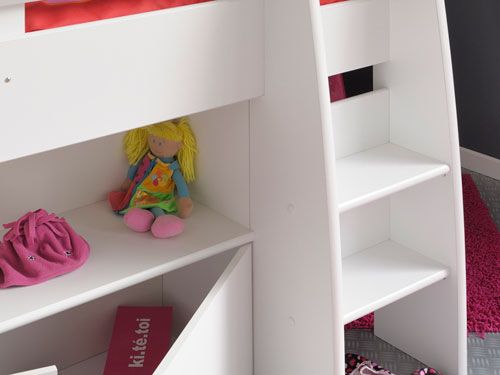 Its compact design provides shelving to every free space, a 2 door cupboard and a free standing desk that fits snuggly under the raised bed section.