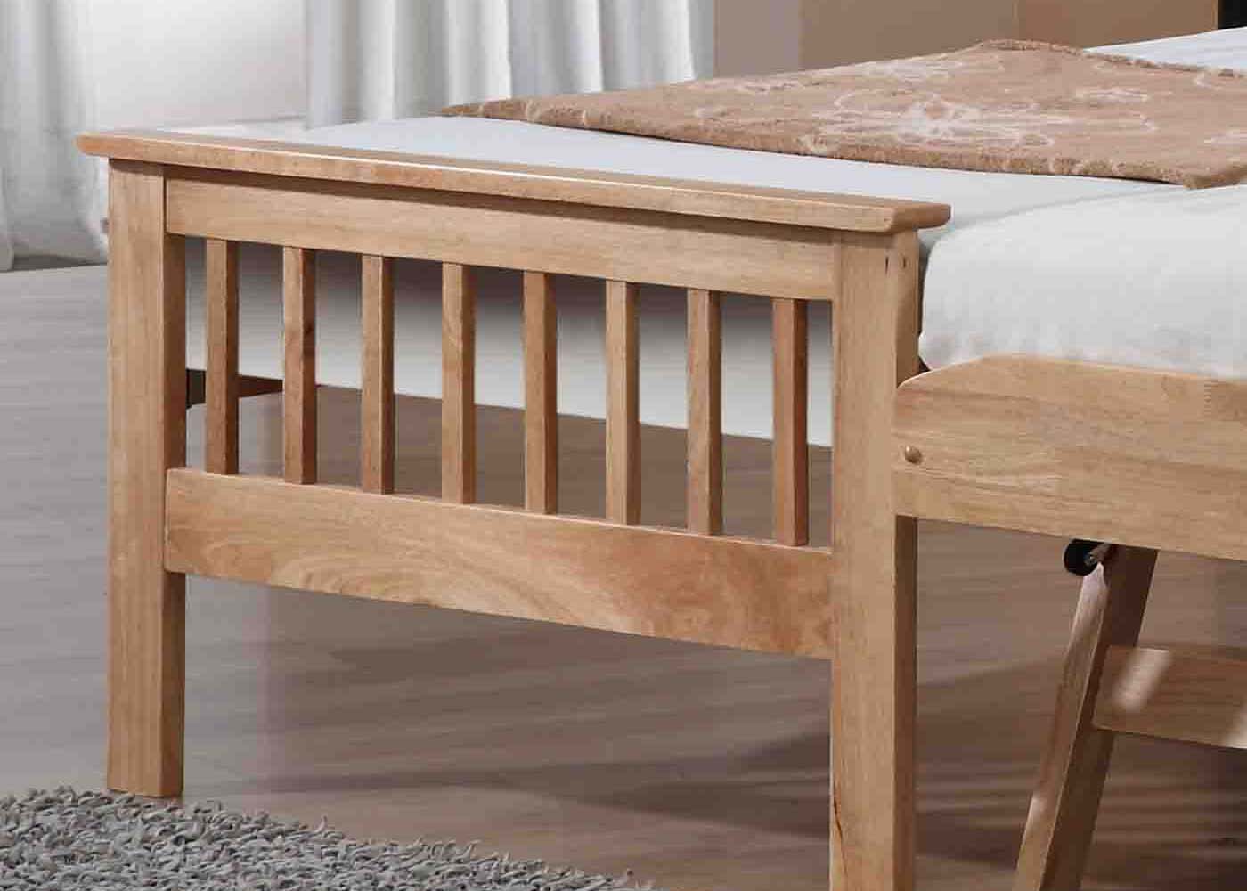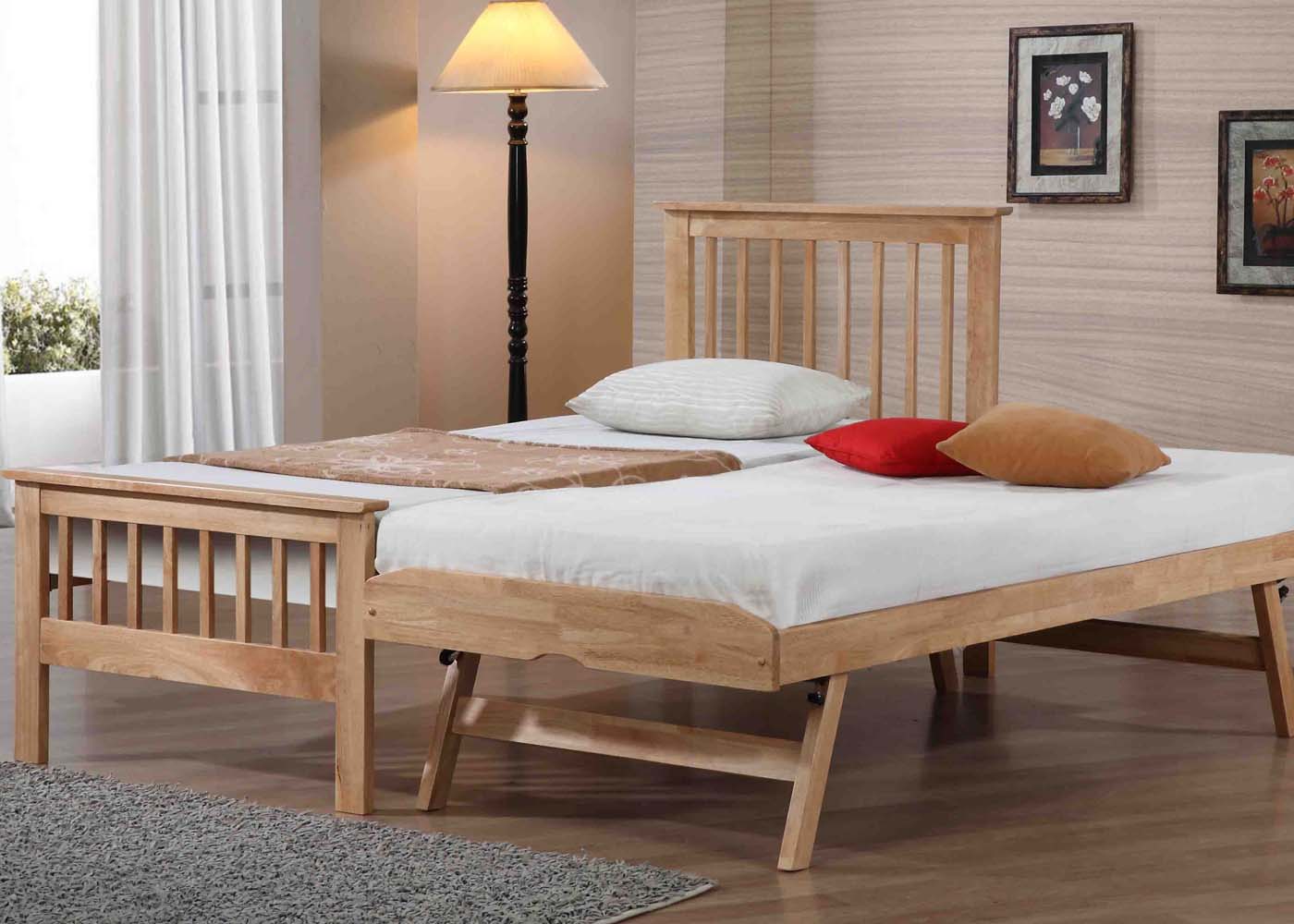 The trundle bed neatly fits under the main bedframe and when required you can pull it out and the legs raise the bed up to the height of the main single bed.