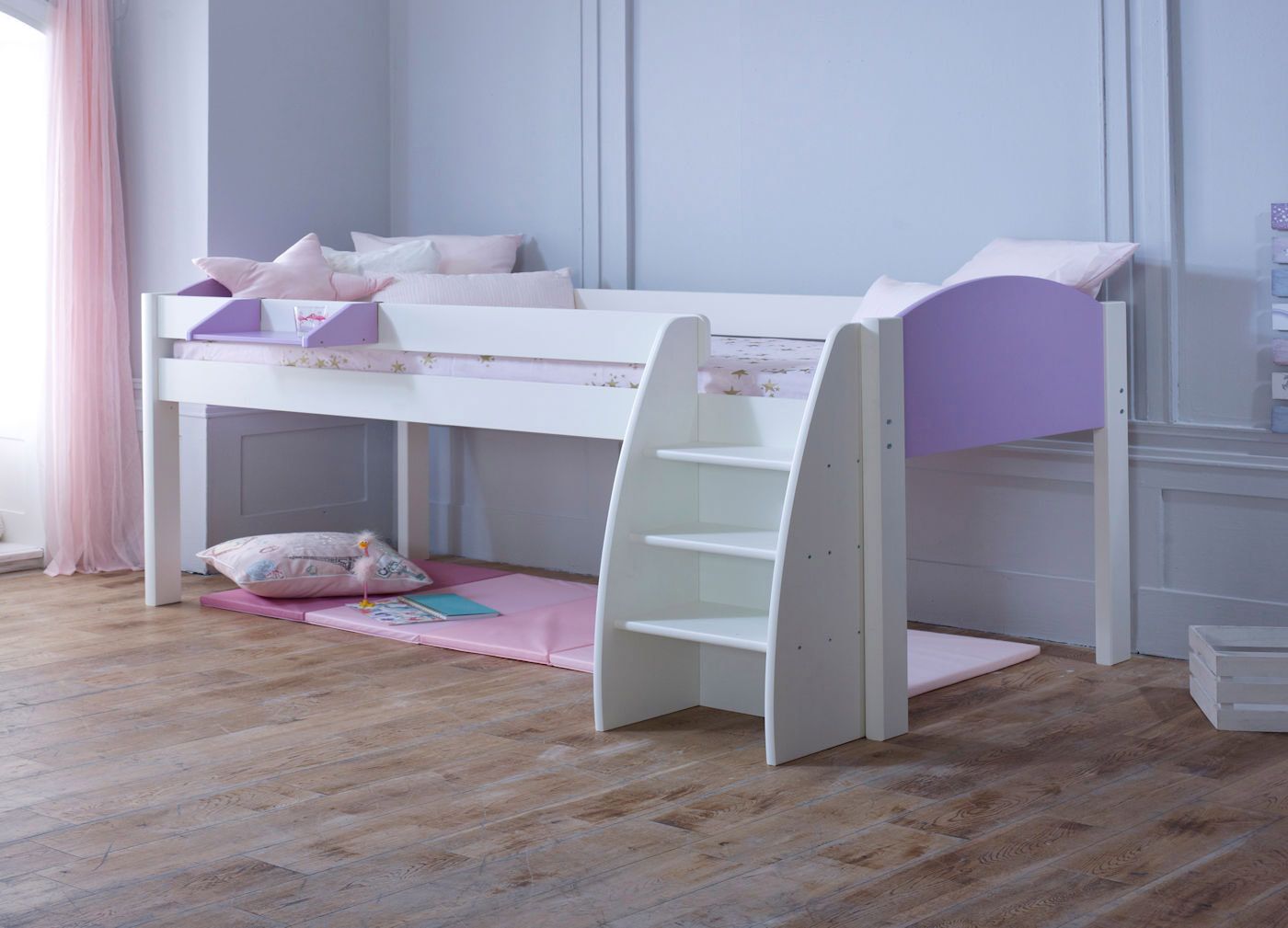 Made from beautiful pinewood and finished in a solid white with the option of white, lilac and blue gable ends, the deep ladder treads offer a stable footing for smaller feet; the ladder can be positioned to either end of the bedframe on assembly.