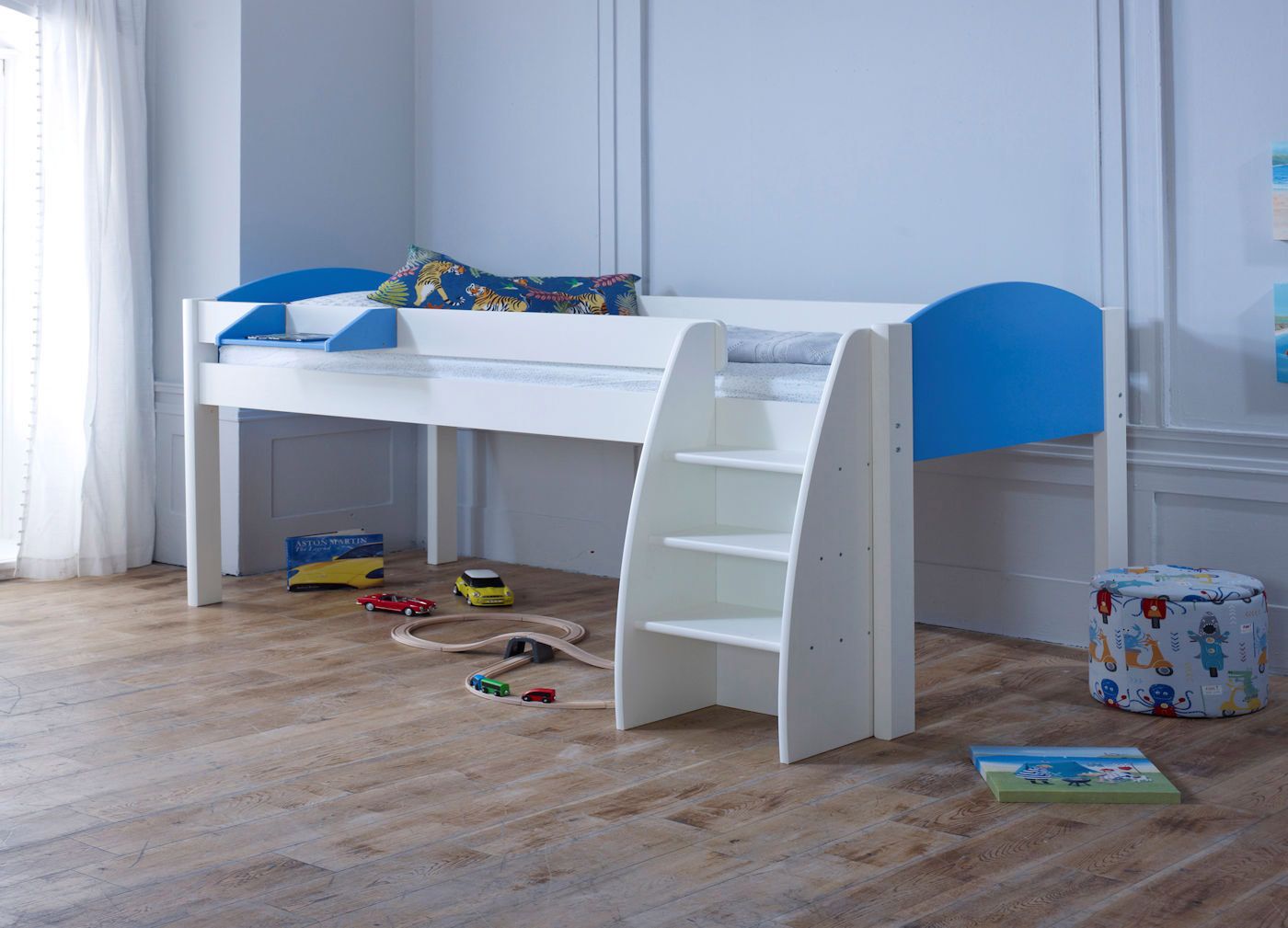 The raised sleeping area provides an open space under the bed for storage or play.